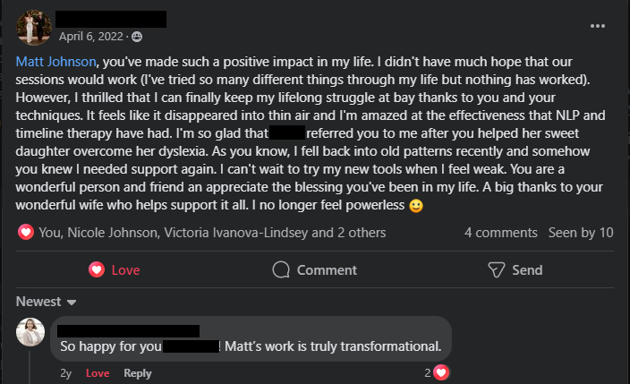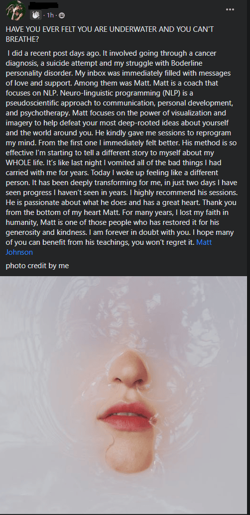 That's why my work isn't based on vague "mindset shifts" or inspirational fluff. It uses powerful tools like Neuro-Linguistic Programming (NLP) and hypnosis—both backed by decades of research and used by elite therapists, peak performers, and trauma experts around the world.